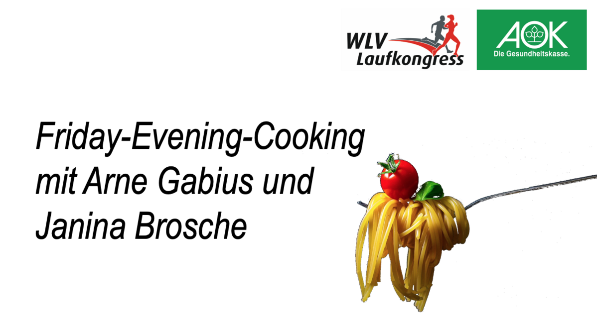 Als Besonderheit des 6. WLV Laufkongresses 2021 wird Ihnen in diesem Jahr ein Friday-Evening-Cooking in Zusammenarbeit mit der AOK Stuttgart-Böblingen angeboten. Innerhalb eines virtuellen Kochkurses werden Arne Gabius und Janina Brosche am Freitag, 26. März (18:00 – ca. 19:30 Uhr) live ein Gericht als optimalen Nährstofflieferant für die praktischen Einheiten des Kongresses am folgenden Tag kochen.